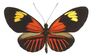 | THESE REPRESENT NATURALLY OCCURRING MIXTURES OF H. MELPOMENE/ERATO?. THEY ARE ALL VERY VARIABLE IN THEIR PATTERNING. THE PICTURE SHOWN IS THE BASIC PATTERN OF THE SPECIMENS YOU WILL RECEIVE. |